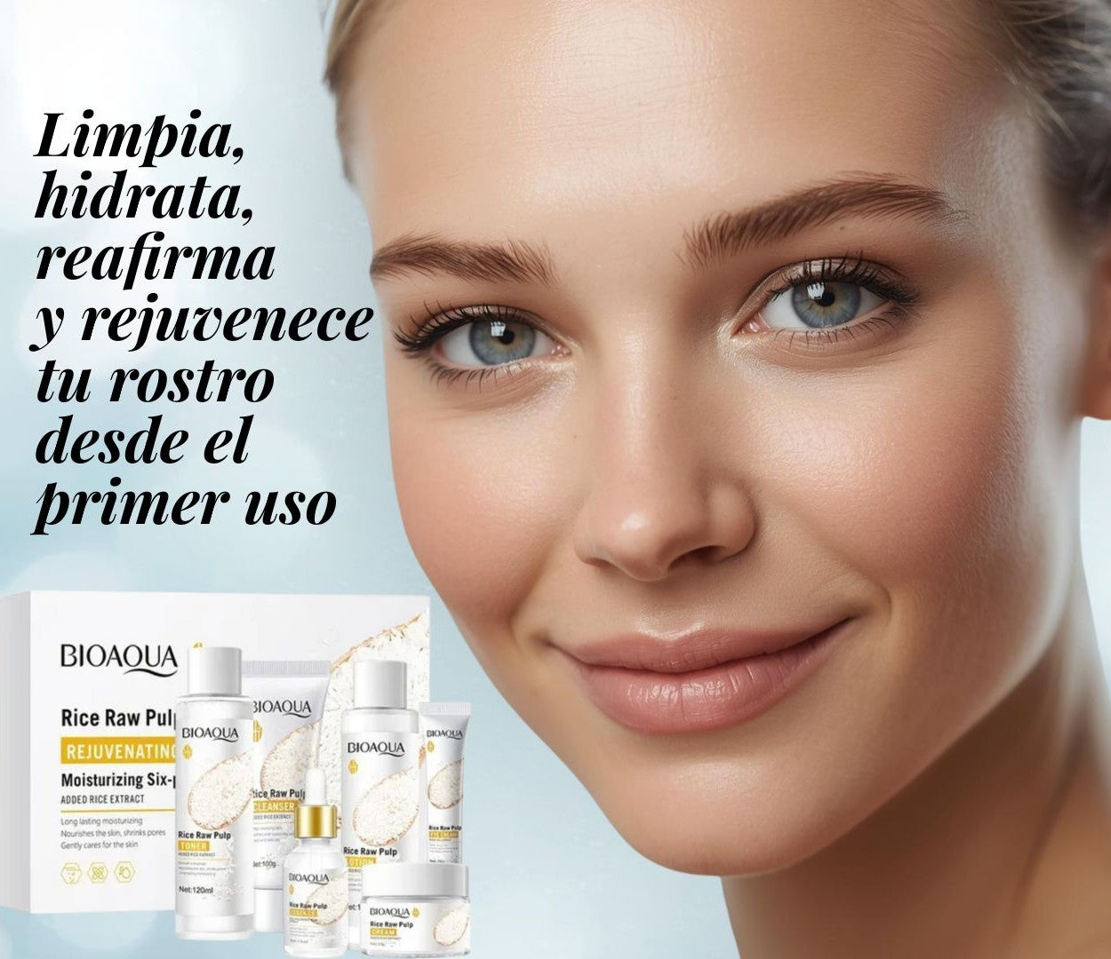 natural, dejándola reseca, sin elasticidad y con signos visibles de envejecimiento. Pero hoy puedes devolverle su juventud y luminosidad con el poder de BioAqua, con su kit Rejuvenecedor Facial de 6 piezas, una rutina facial completa con extracto natural de arroz que limpia, hidrata, reafirma y rejuvenece tu rostro desde el primer uso BioAqua combina la sabiduría oriental con ingredientes naturales para una piel suave, firme y radiante. Conoce cada uno de sus beneficios🌾.