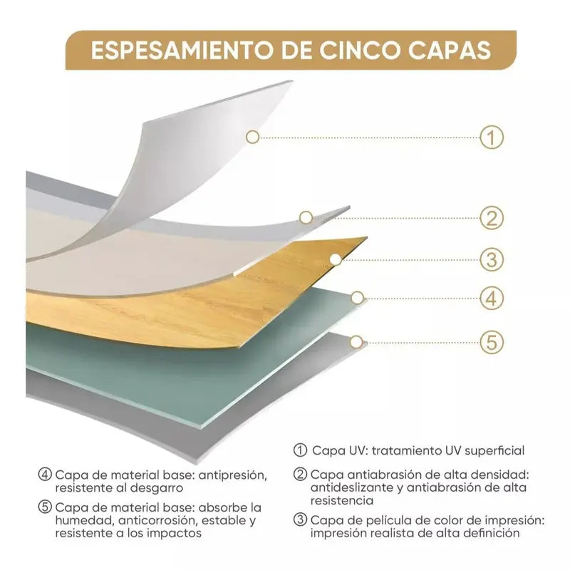 Fabricado con PVC de alta calidad y recubrimiento UV, este piso vinílico ofrece una protección superior frente al desgaste diario, incluso en zonas de alto tránsito como salas, pasillos o cocinas.