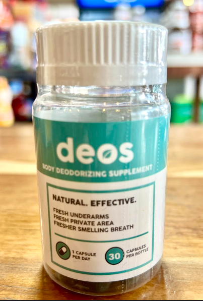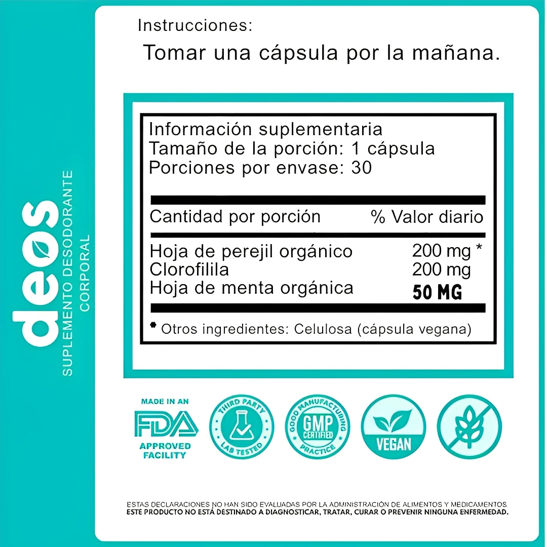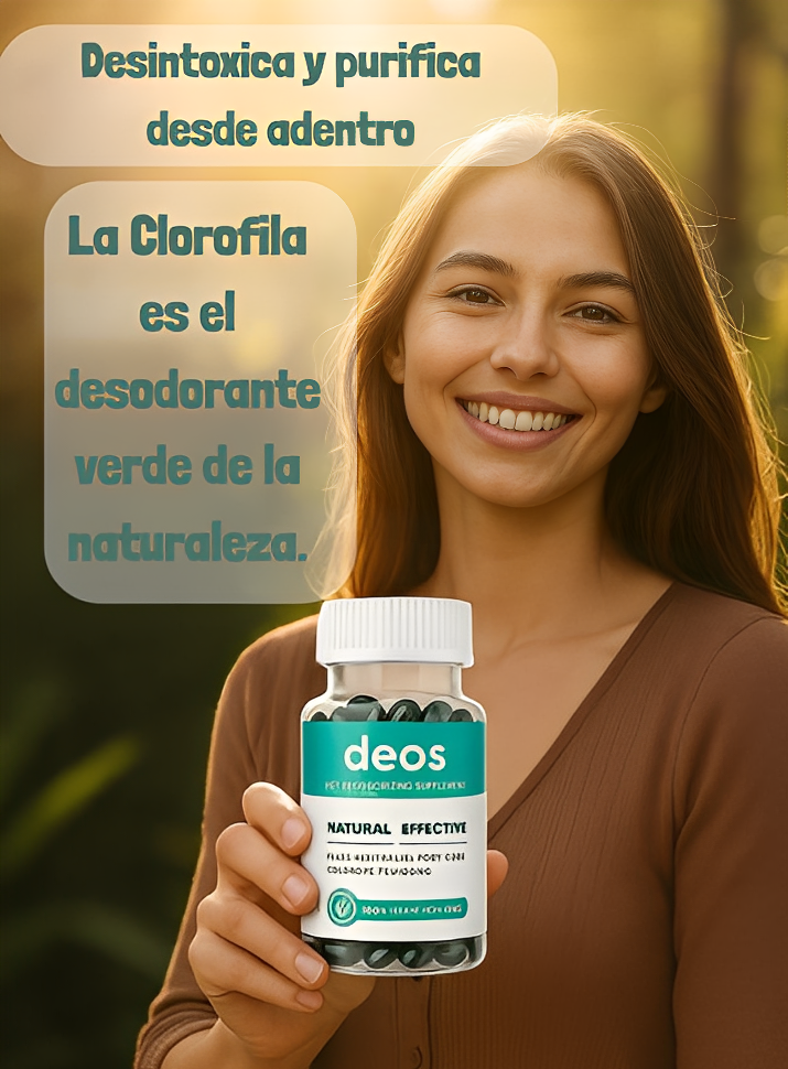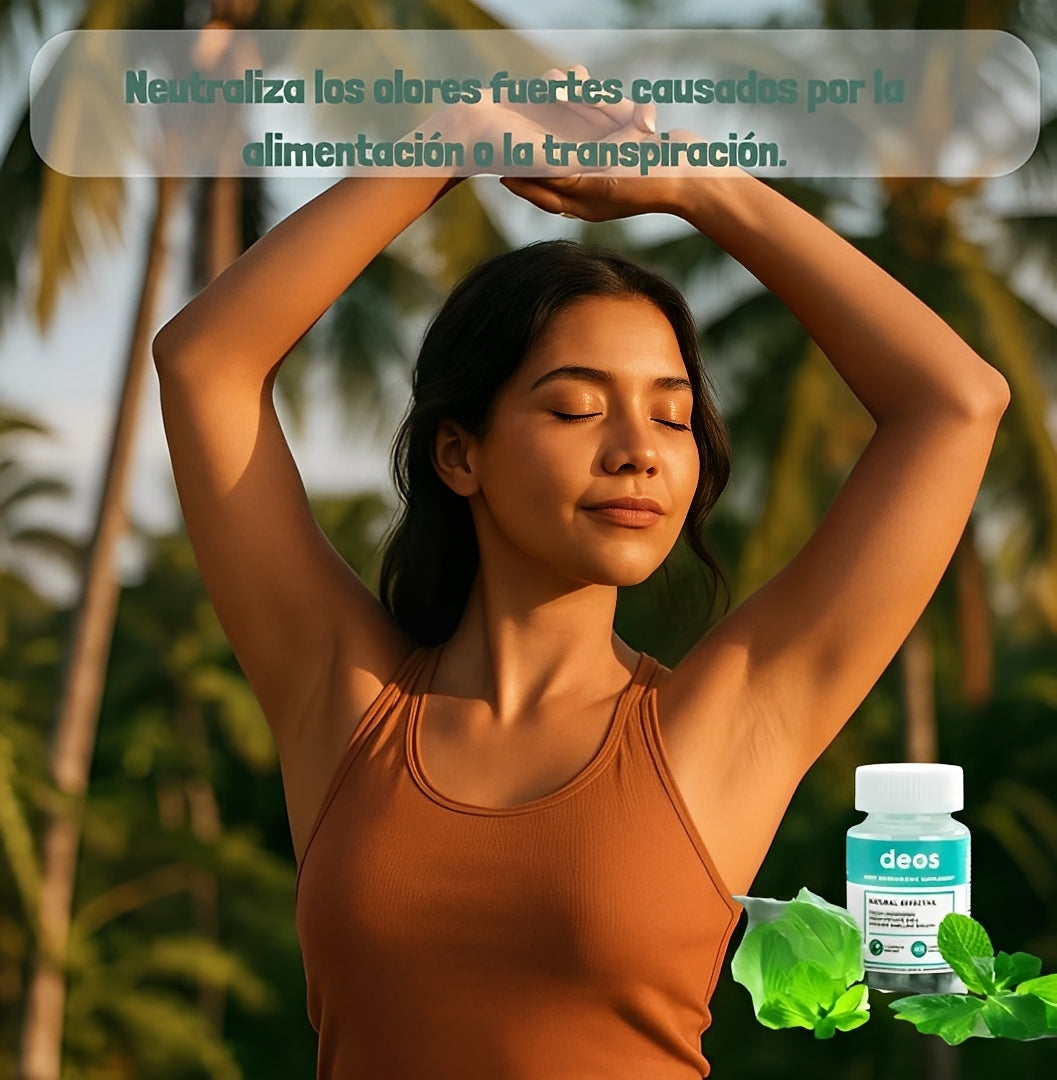 DEOS es un suplemento natural a base de clorofila, menta y perejil que actúa como desodorante interno, ayudando a eliminar los olores corporales desde su origen.