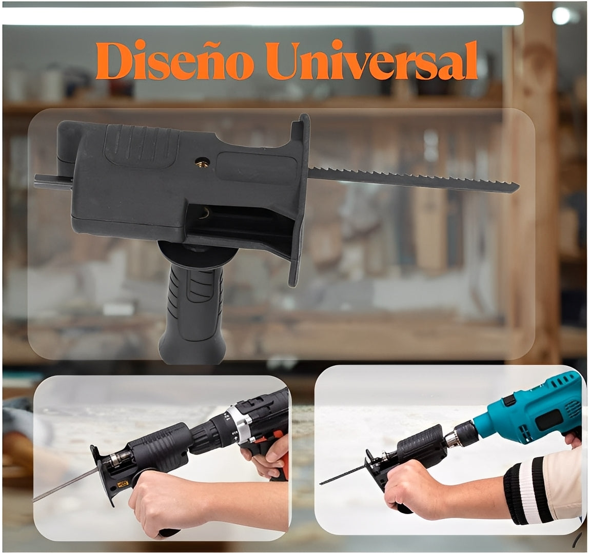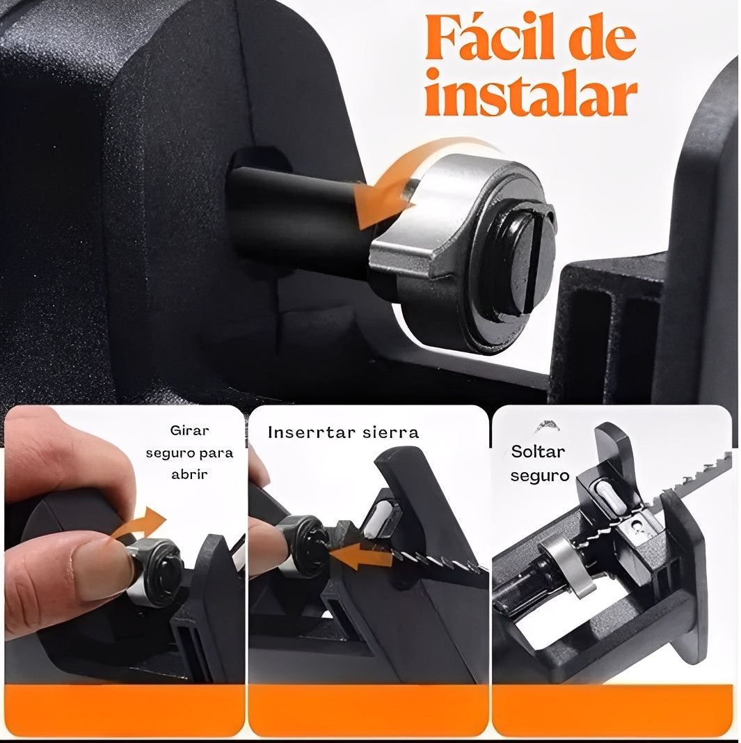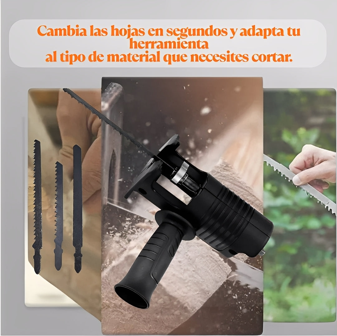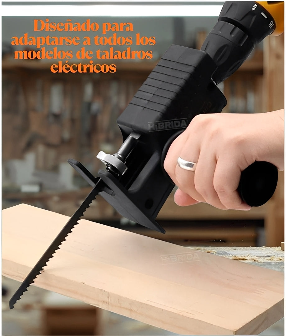 Este innovador adaptador convierte tu taladro eléctrico en una caladora portátil, perfecta para cortes rectos o curvos en madera, plástico o metal.