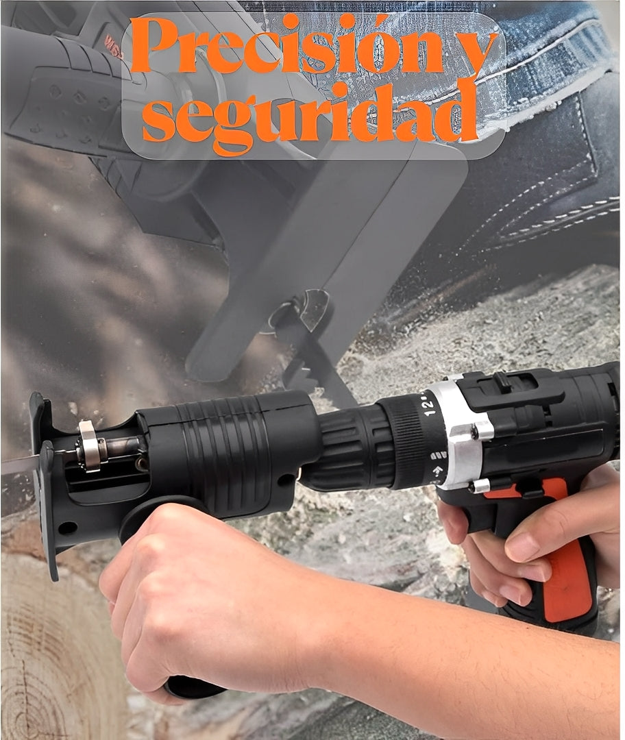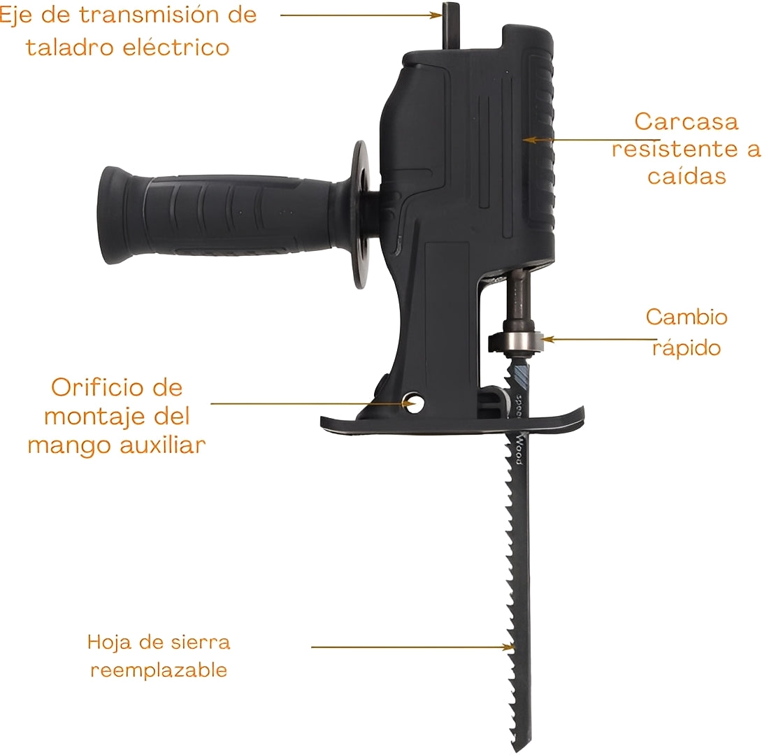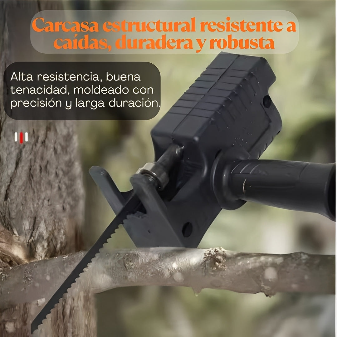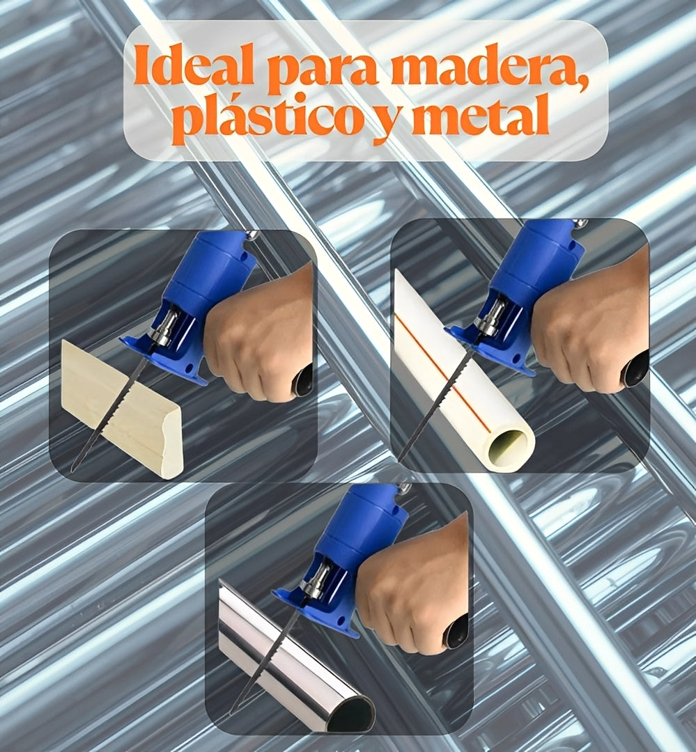 Este innovador adaptador convierte tu taladro eléctrico en una caladora portátil, perfecta para cortes rectos o curvos en madera, plástico o metal.