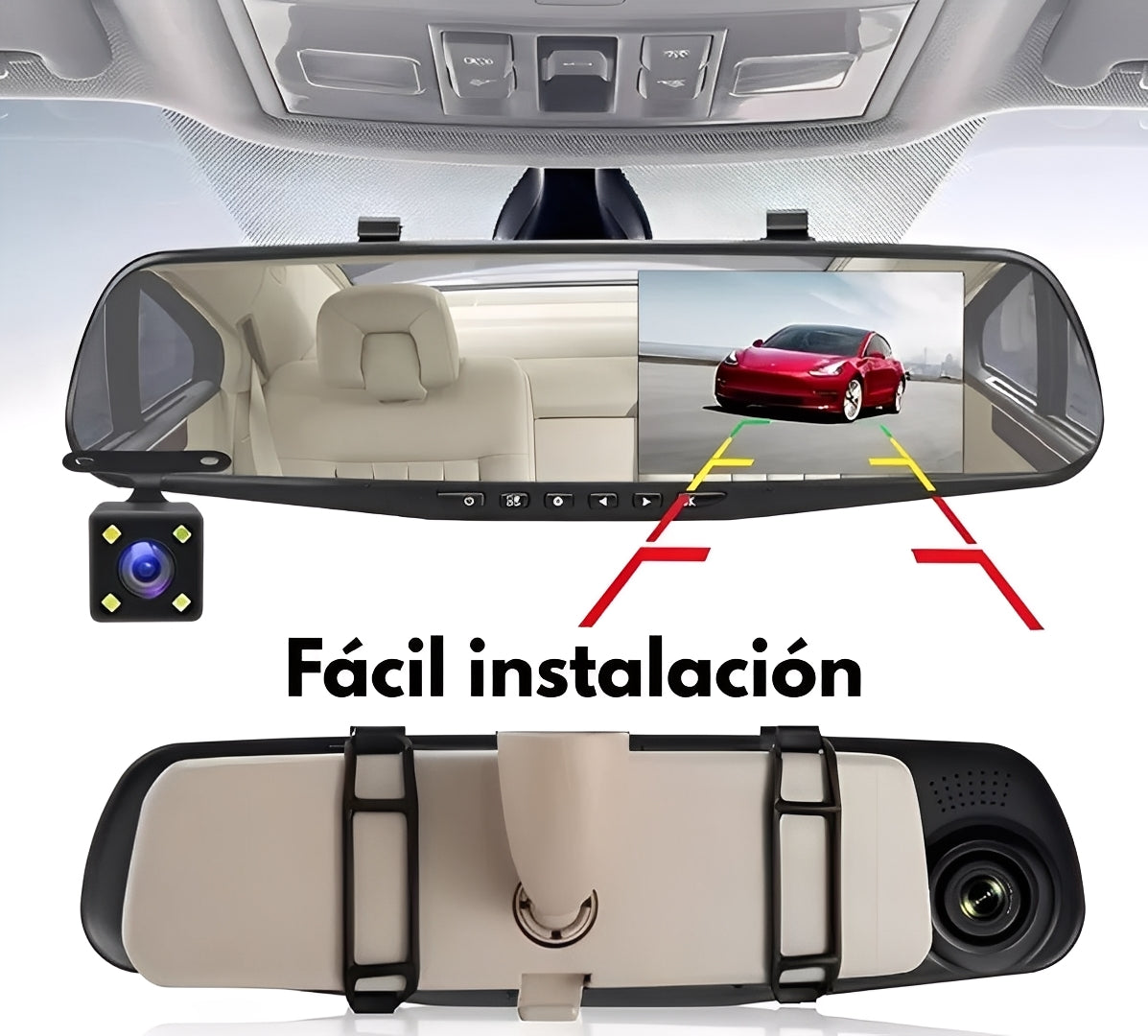 No necesitas ser un experto para instalar DualCam Pro. Se coloca sobre tu espejo retrovisor existente sin necesidad de modificar cables o la estructura de tu auto. En pocos minutos, tu vehículo estará equipado con una cámara profesional de