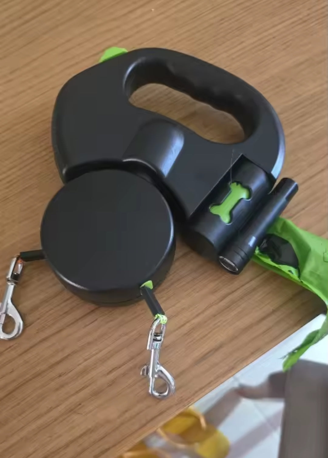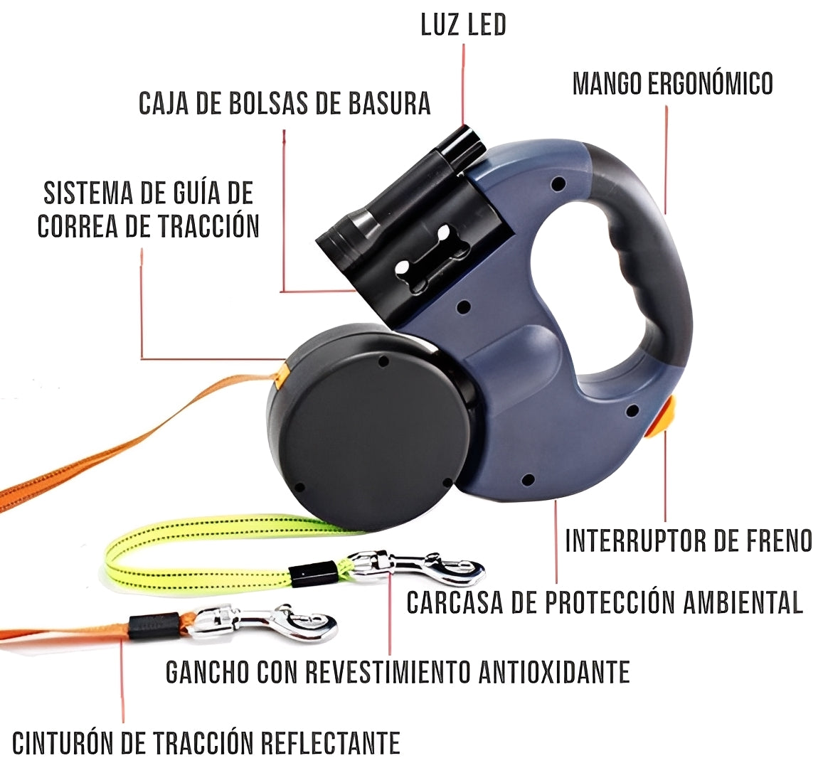 La caja multifunción es genial, puedo llevar sus golosinas y bolsas sin preocuparme. Además, el sistema retráctil funciona perfecto y no se enreda nunca. ¡Estoy muy feliz con la compra!