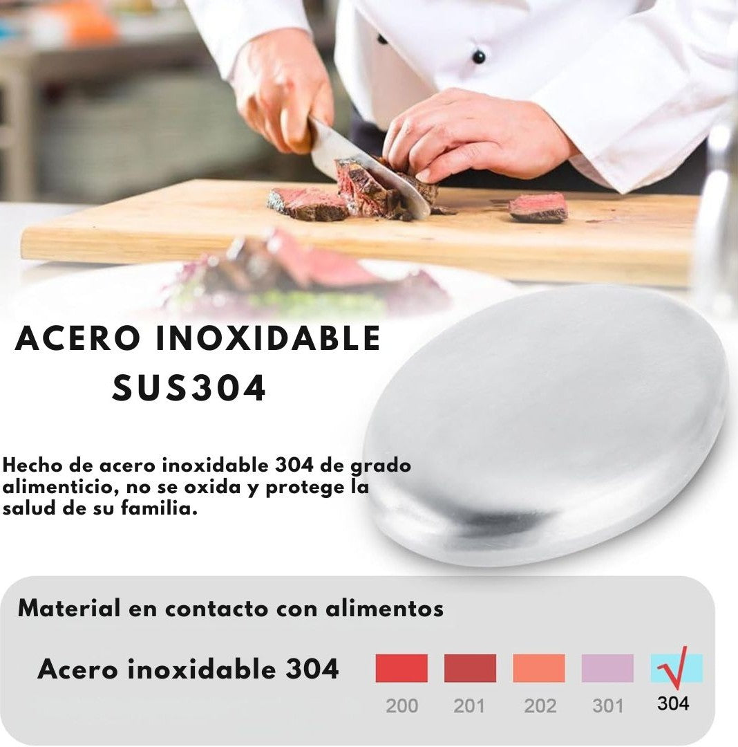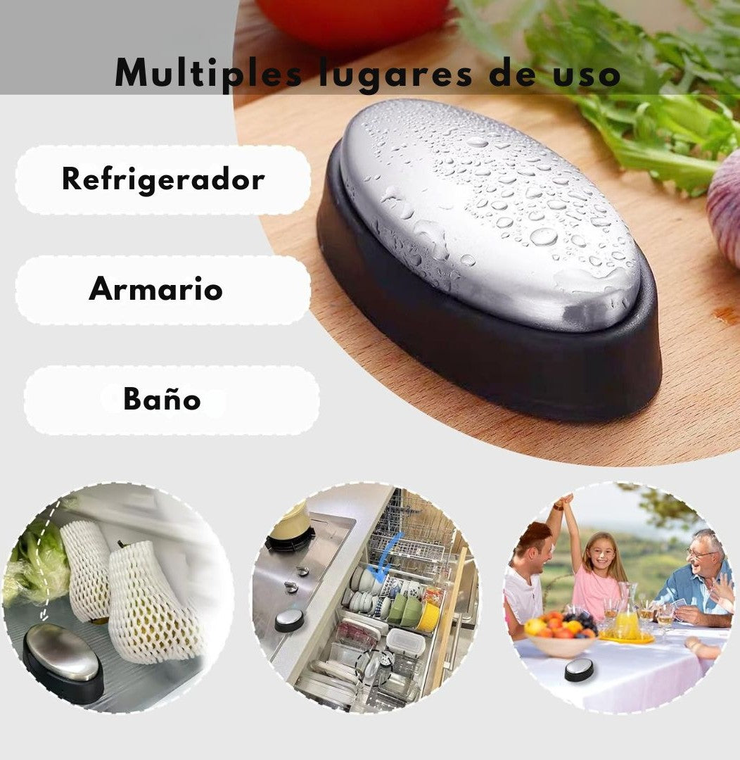 Con OdorOff Steel, di adiós a esos olores molestos. Esta barra de acero inoxidable especial elimina aromas fuertes sin usar detergente, solo necesitas agua 💧. Frota tus manos como si fuera un jabón normal... ¡y listo!