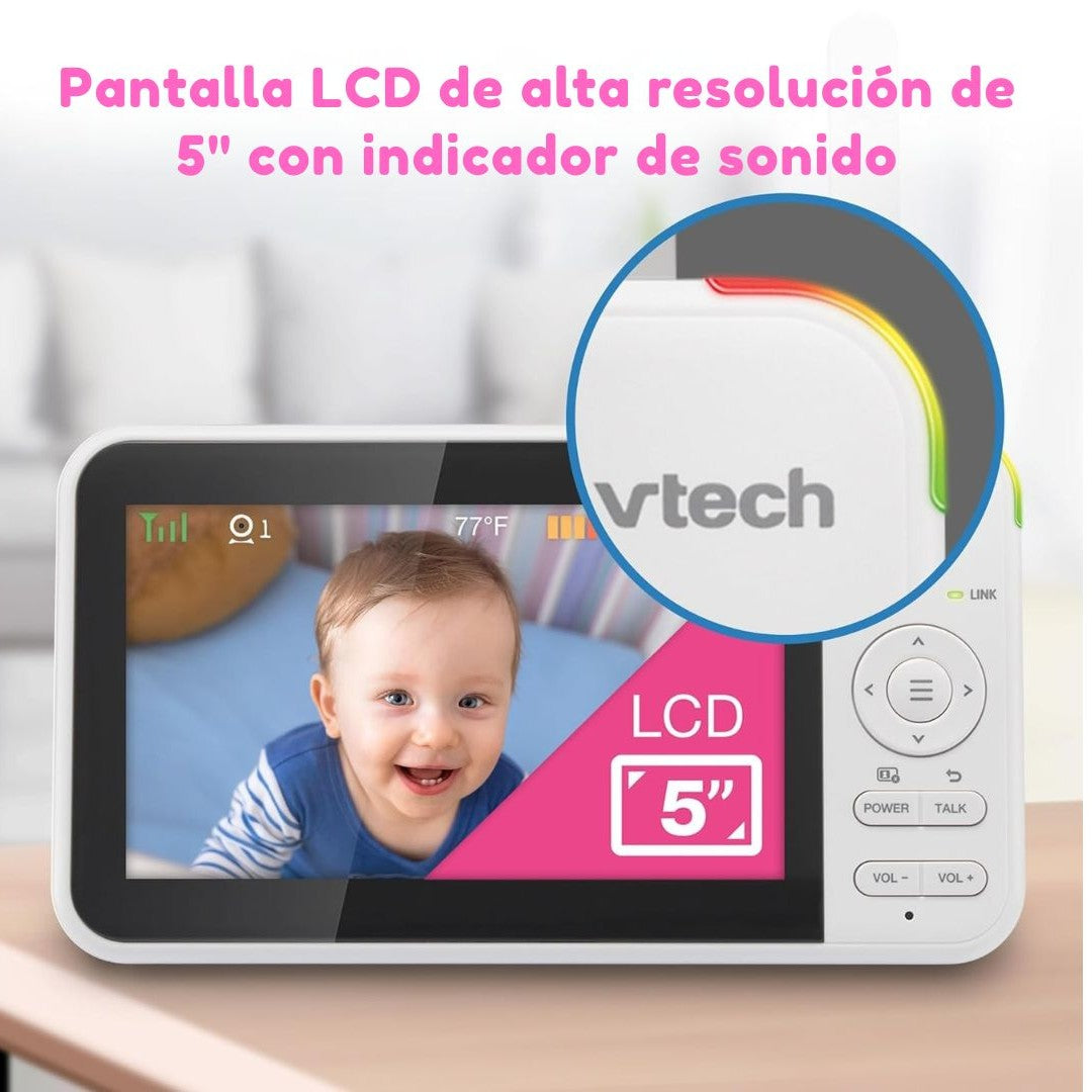 Disfruta de una pantalla LCD de 5” en alta resolución que te muestra cada movimiento y expresión de tu bebé incluso en la oscuridad.